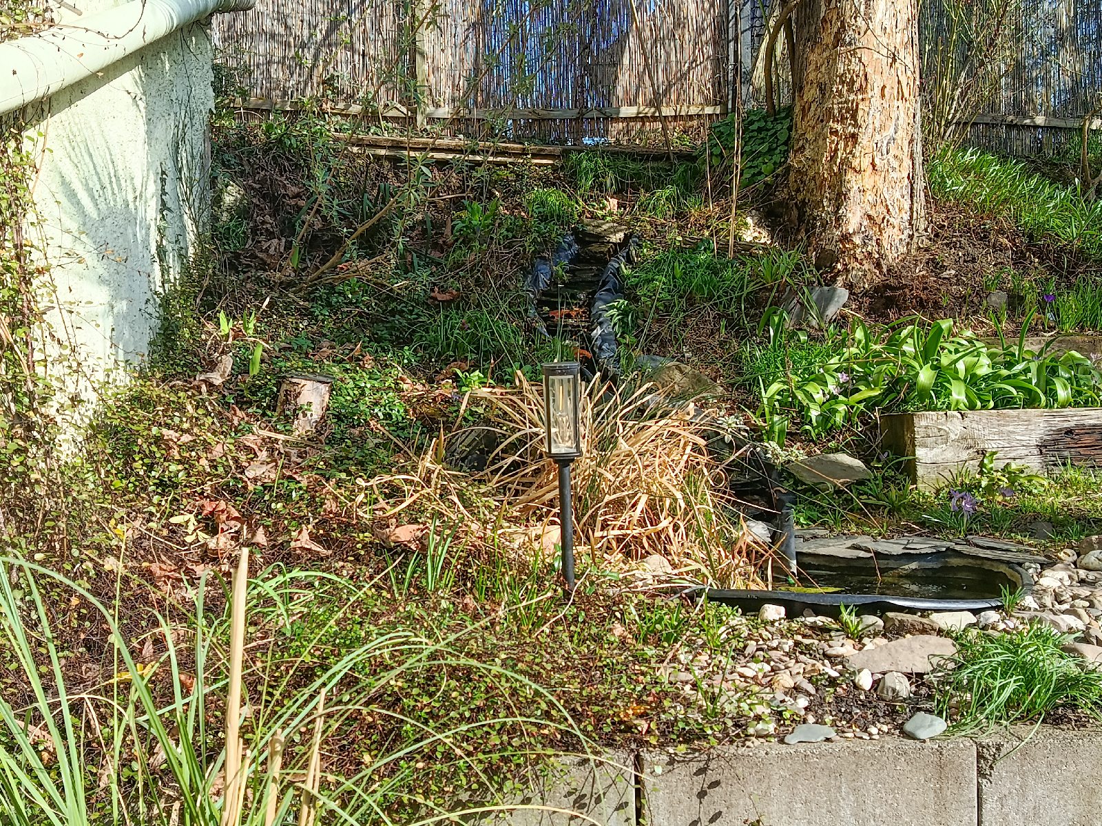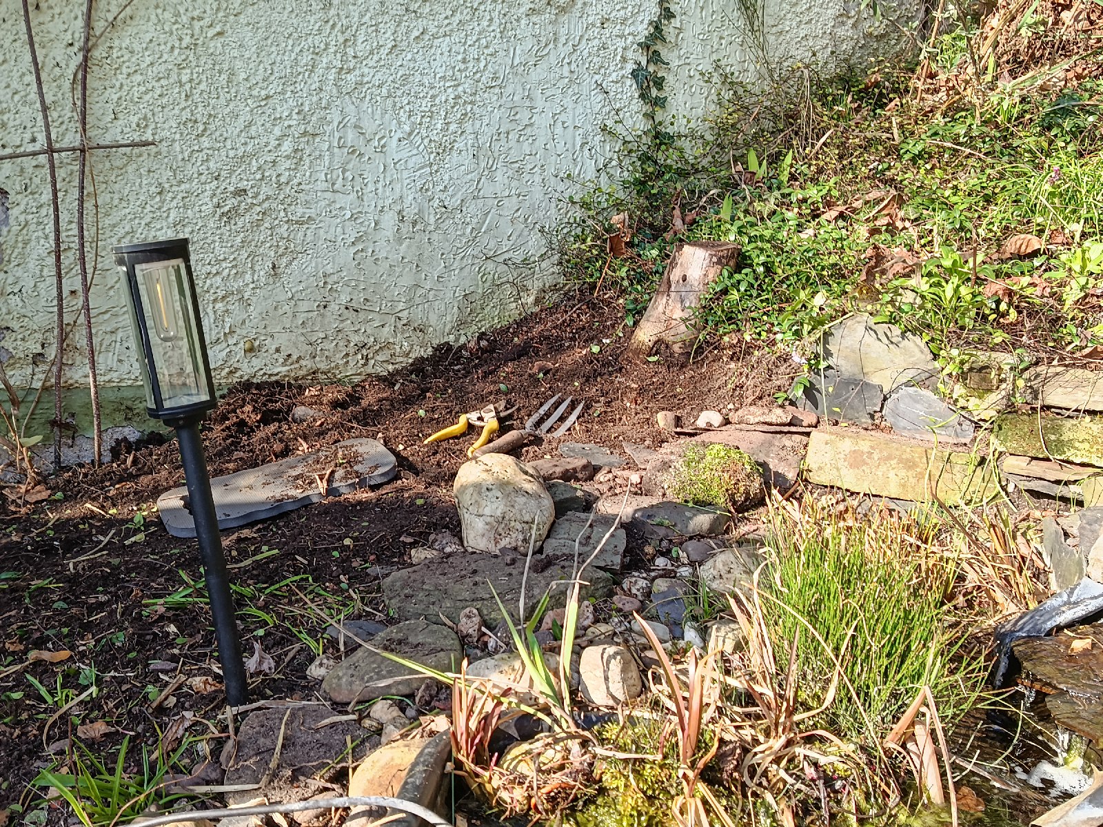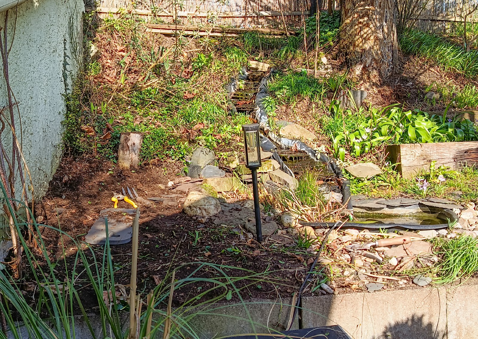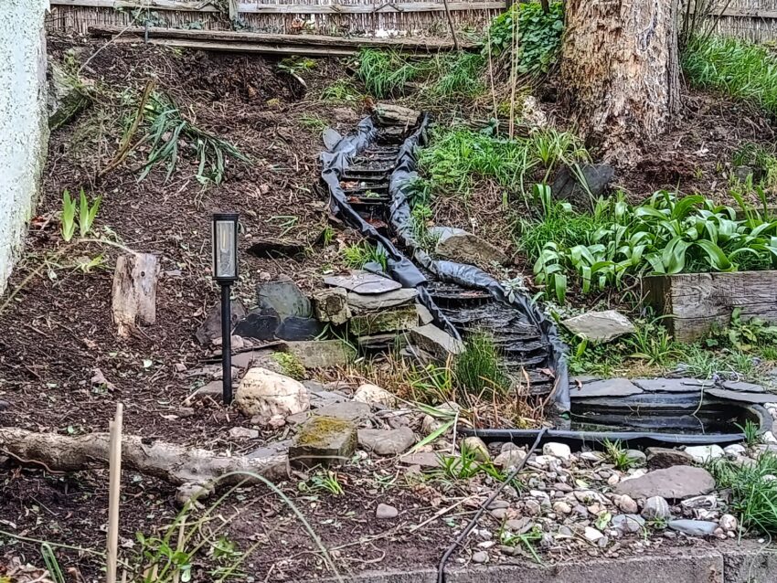 Nun habe ich den letzten Abschnitt in Angriff genommen. Das ist der Bereich neben dem Bachlauf, der von der Mühlenbeckia erobert worden war. Ihr erinnert euch an die Aktion im letzten Jahr als wir die fette Matte von der Wand entfernt haben? Jetzt ist der Boden dran.