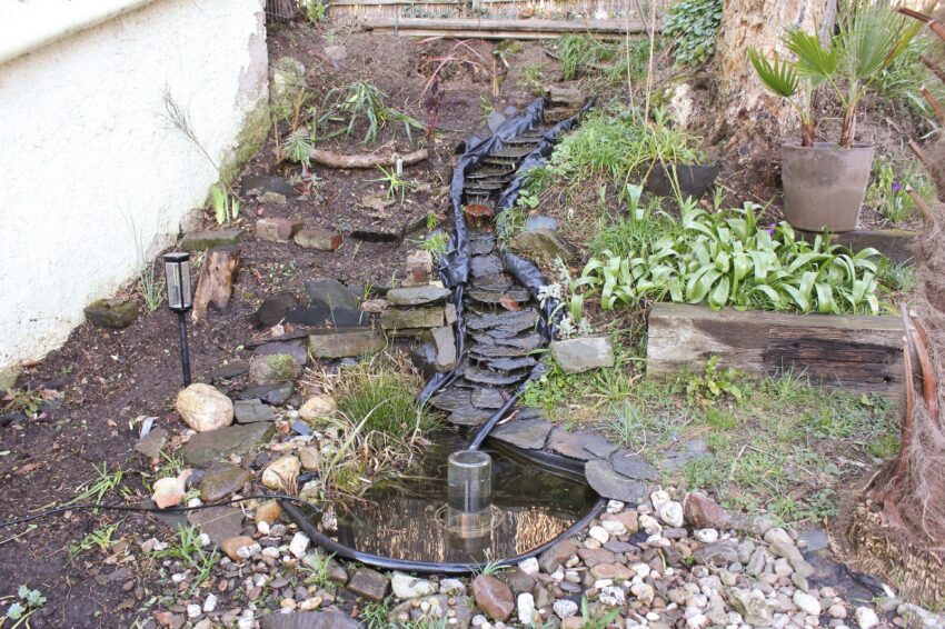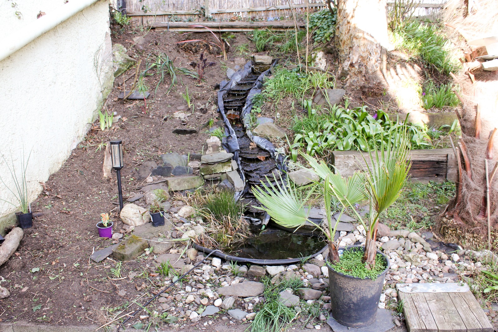 Hier ein Foto von der Treppe aus gesehen. Es geht um den Streifen hinter dem Bachlauf vor der Wand.