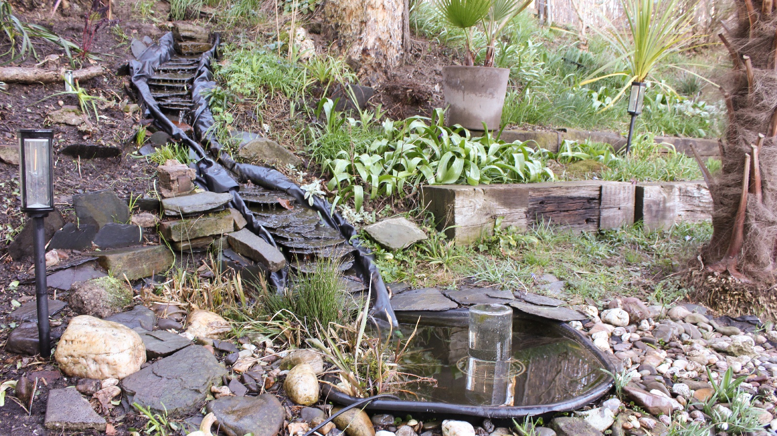 Im Wesentlichen arbeite ich mit der natürlichen Geländeform und ergänze mit Materialien, die sich natürlich einfügen. Dazu benutze ich alte Ziegel, Natursteine und immer wieder baue ich auch Totholz ein. Das hält zwar nicht ewig, bietet aber Lebensraum für Insekten, Pilze und Kleinstlebewesen, was ich für enorm wichtig halte, und kann einfach ersetzt werden, wenn es zu sehr verrottet ist. Das ist besser als jedes Insektenhotel aus dem Baumarkt, dass meist sowieso eher verkaufs. – als insektenfördernd ist. Diese in den Hang eingebauten Materialien halten obendrein die Erde zurück und bilden Pflanztaschen in den sich Wasser und Nährstoffe besser halten, als in einem schrägen Hang, wo Regen und Gießwasser schnell alles wegspülen.